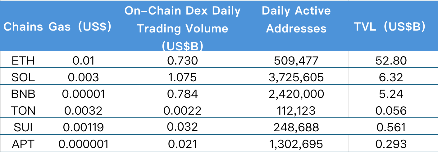 主要从日交易量、日活跃地址、交易费用分析目前主要Layer1含ETH、SOL、BNB、TON、SUI以及APTOS的相关数据。