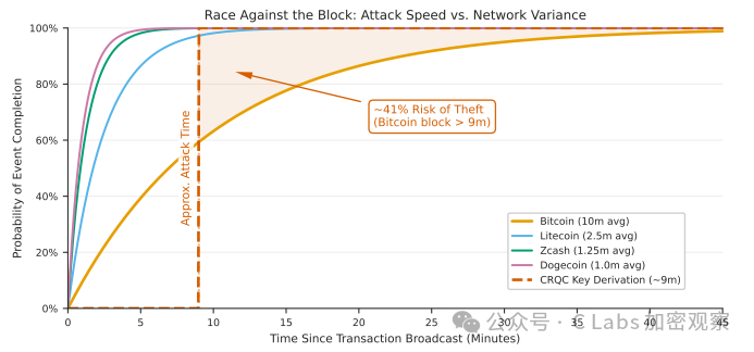而量子计算机可以在约9分钟内推导出私钥并盗走资金——而比特币交易确认需要约10分钟,成功概率接近41%。