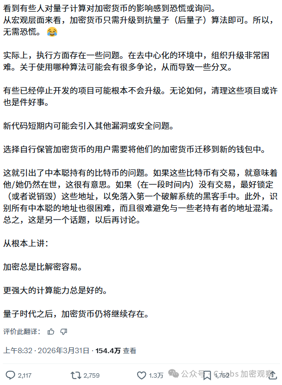 比特币这边也不是坐以待毙,CZ表示只要升级抗量子加密算法即可。
