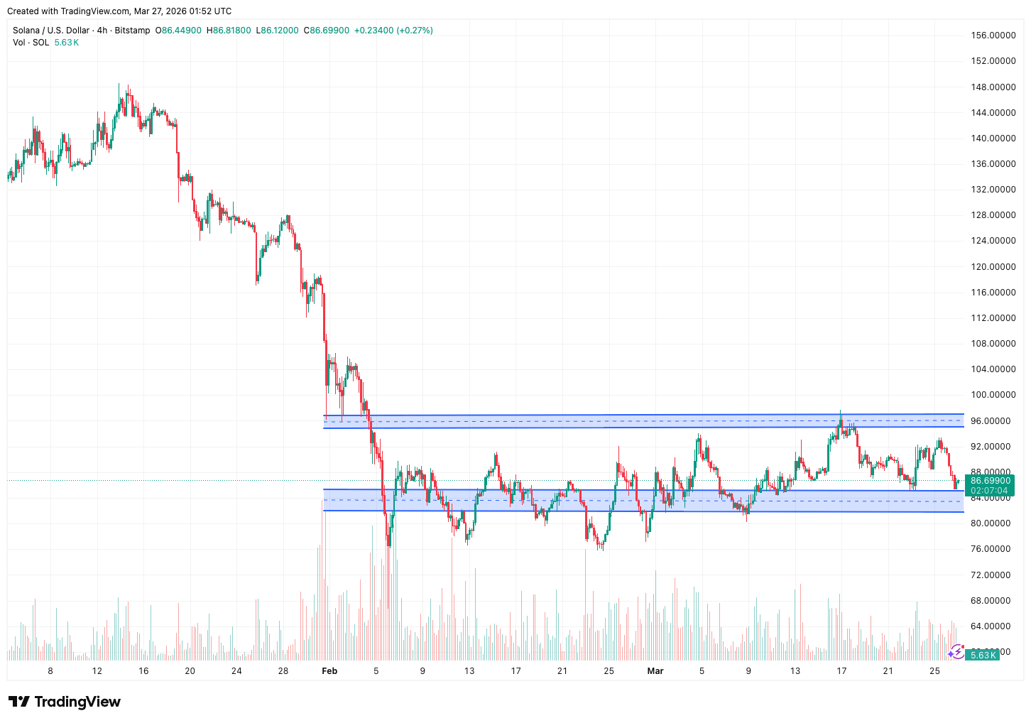 3月Solana整体表现相对平稳,在$82–$97区间内运行,相对BTC和ETH展现出一定韧性。截至3月27日,SOL约报$88–$92,较2月底小幅震荡。短期支撑主要集中于$82–$85区间,该位置近期多次发挥托底作用;上方$95–$97为关键阻力区,对应3月中旬阶段高点,突破需要较强的成交量配合。若SOL能有效站稳$90以上并放量突破$97,有望开启向$100–$105的修复行情;反之,若失守$82,则可能进一步下探$75–$78附近的中期支撑。整体来看,SOL波动性依然较大,在宏观风险偏好改善前,价格或继续在$82–$97区间内寻求方向性突破