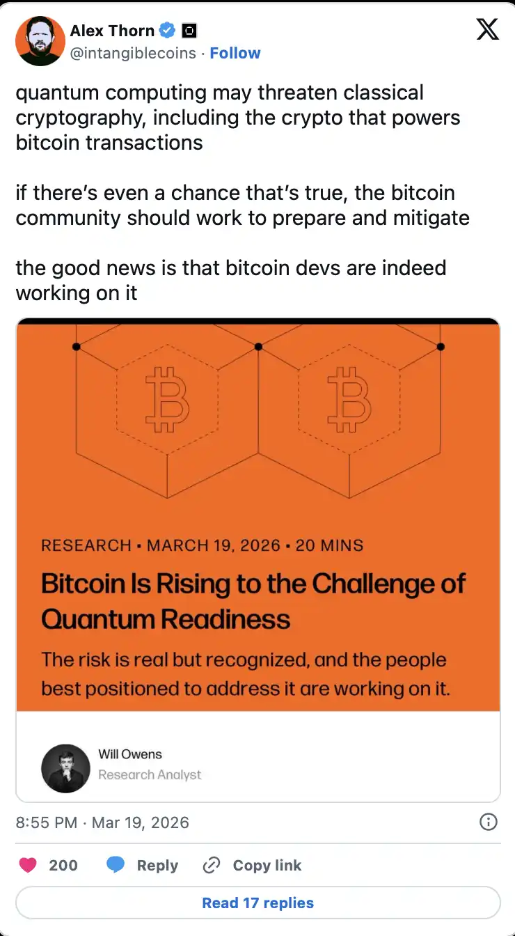 但另一条同样清晰的线索是,应对也在同步推进。从比特币社区的后量子方案探索,到科技机构给出的迁移时间表,一场围绕「量子时代」的安全重构已经启动。