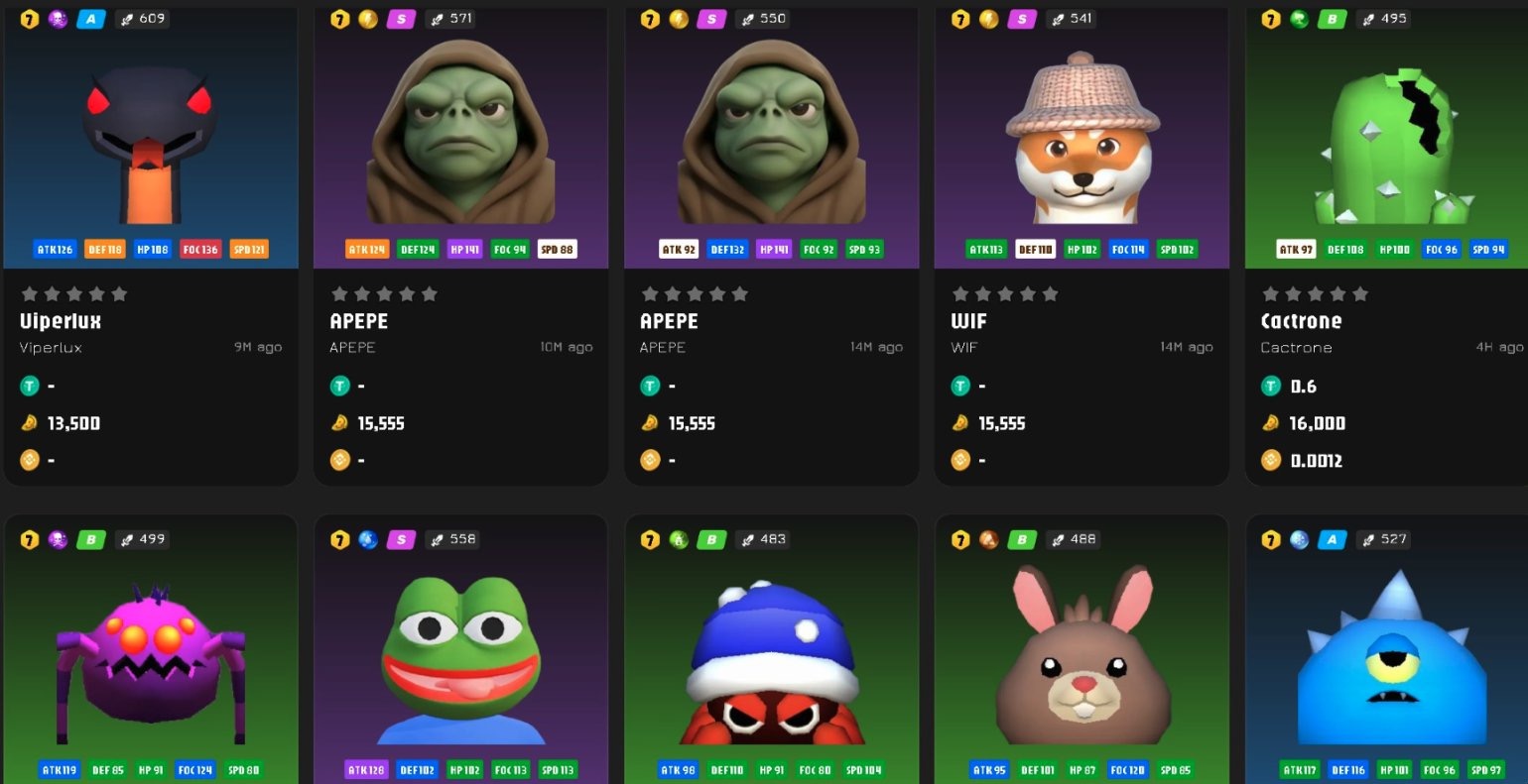 在这里,你带着抓到的宠物进行 5 人混战(Last Meme Standing 模式)。没有永远的盟友,只有宠物数值和装备策略决定胜负。为了赢,你不得不去市场上租更好的宠物、升级装备、质押代币。每一次交易、租赁、战斗都在真实消耗代币。Meme IP 不再是 K 线图上的一个代码,而是真的 「活」 了起来。