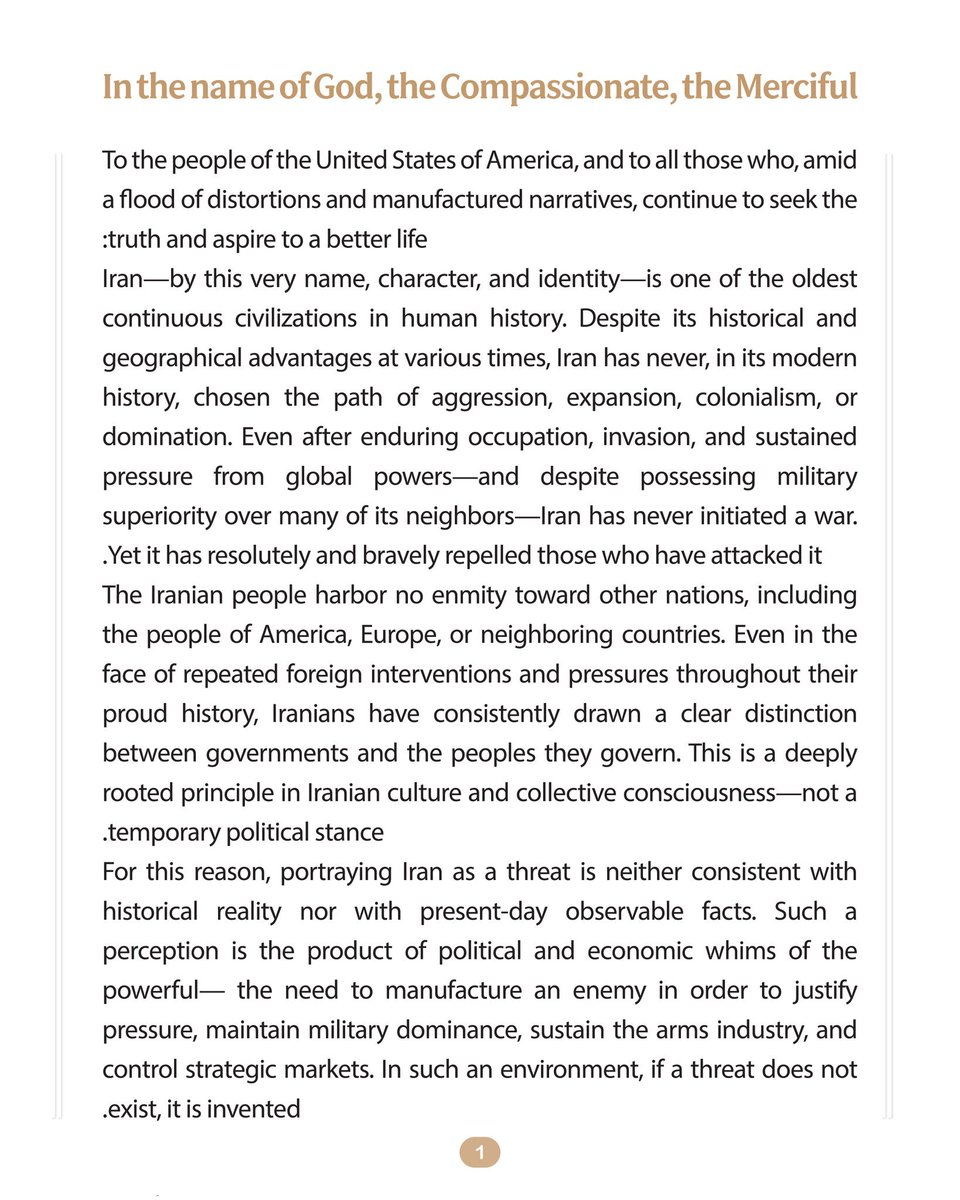 伊朗人民对其他国家并无仇恨,包括对美国人民、欧洲人民以及周边国家人民也一样。即使在其自豪历史中不断遭遇外来干涉与压力,伊朗人始终清楚地区分“政府”与“人民”。这是一项深深植根于伊朗文化与集体意识中的原则,而不是一种暂时的政治姿态。