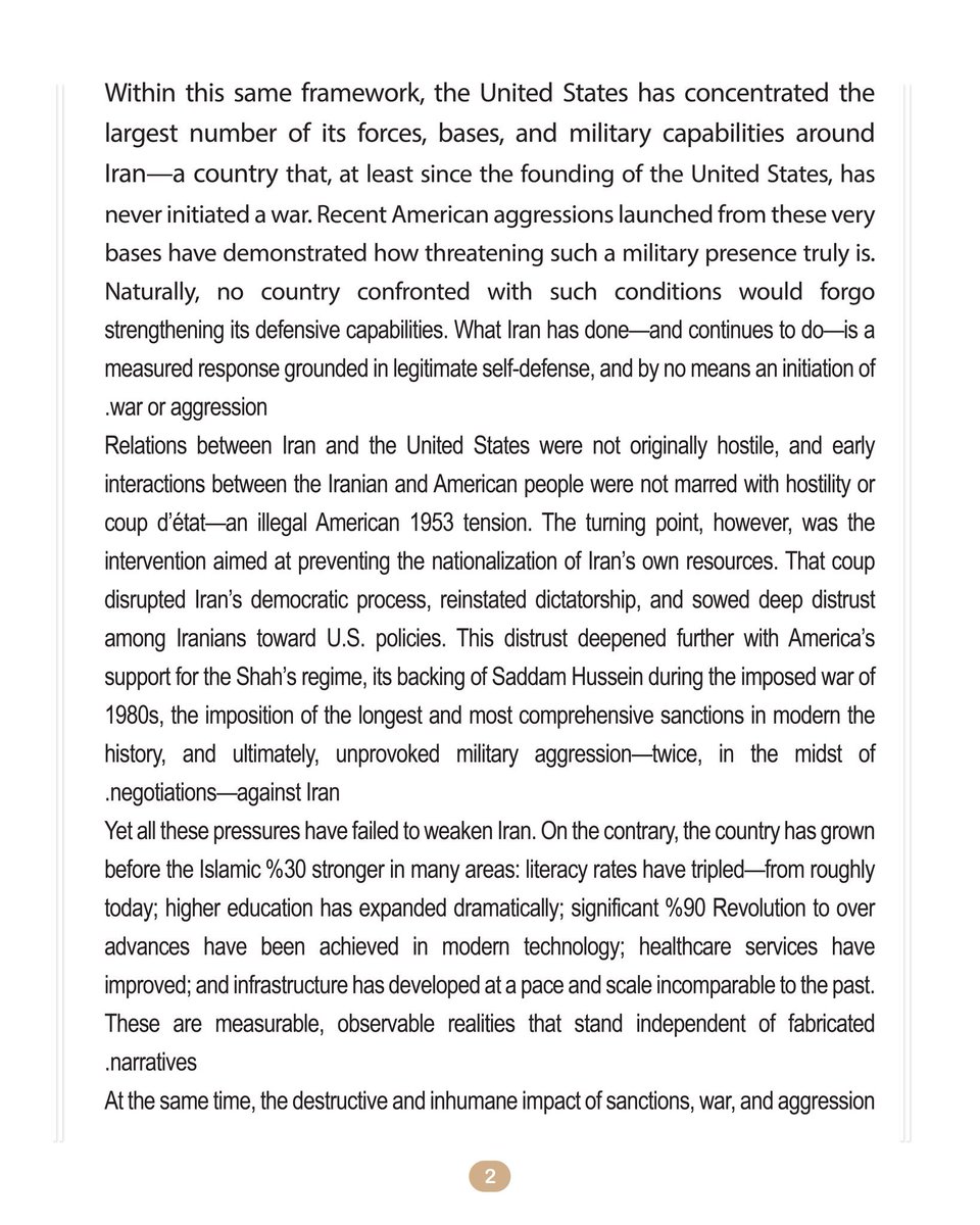 伊朗——仅仅从这个名字、这种气质与身份本身而言——就是人类历史上最古老、延续时间最长的文明之一。尽管在不同历史时期,伊朗都拥有重要的历史与地理优势,但在其现代历史中,伊朗从未选择过侵略、扩张、殖民或支配的道路。即便经历过占领、入侵以及来自全球强权的长期施压——即便其军事实力一度强于许多邻国——伊朗也从未主动发动过战争。相反,对于所有攻击它的人,伊朗都坚决而勇敢地予以击退。
