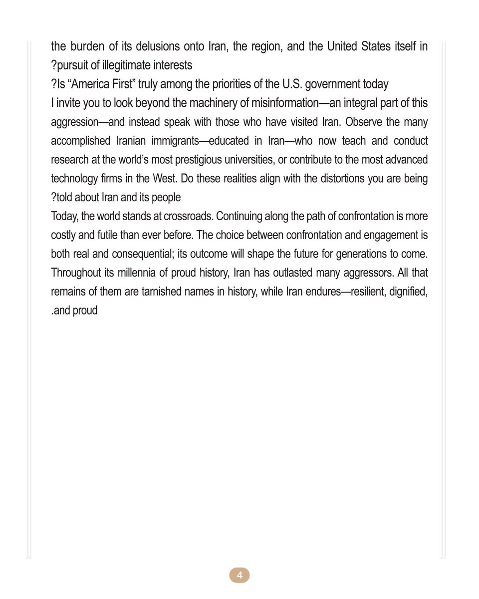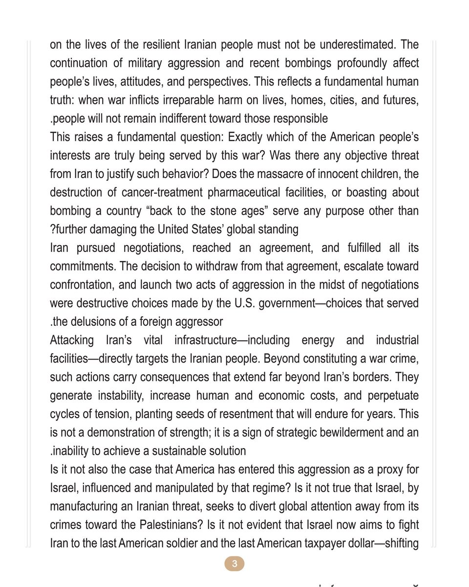 我邀请你们跳出这台制造错误信息的机器——而这台机器正是这场侵略不可分割的一部分——去和那些去过伊朗的人交谈。去看看那些成就卓著的伊朗移民——他们在伊朗受教育,如今却在世界最负盛名的大学任教、从事研究,或在西方最先进的科技公司作出贡献。这些现实,和你们被灌输的关于伊朗及伊朗人民的那些扭曲说法,真的一致吗?