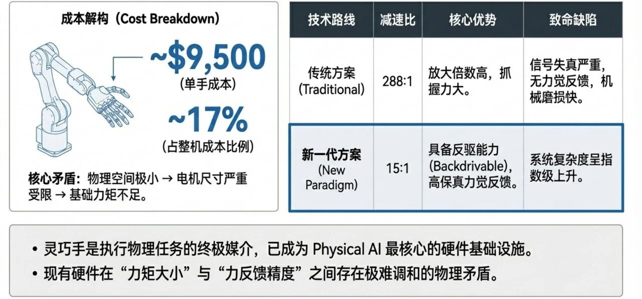 灵巧手之所以难,在于一个根本性矛盾:手指空间太小,放不下大电机;小电机力矩不够,就需要高减速比齿轮箱来放大力量;而高减速比齿轮箱会带来惯性失真、力反馈丧失和机械磨损——这三个问题会从物理层面「毒化」AI 的学习过程。