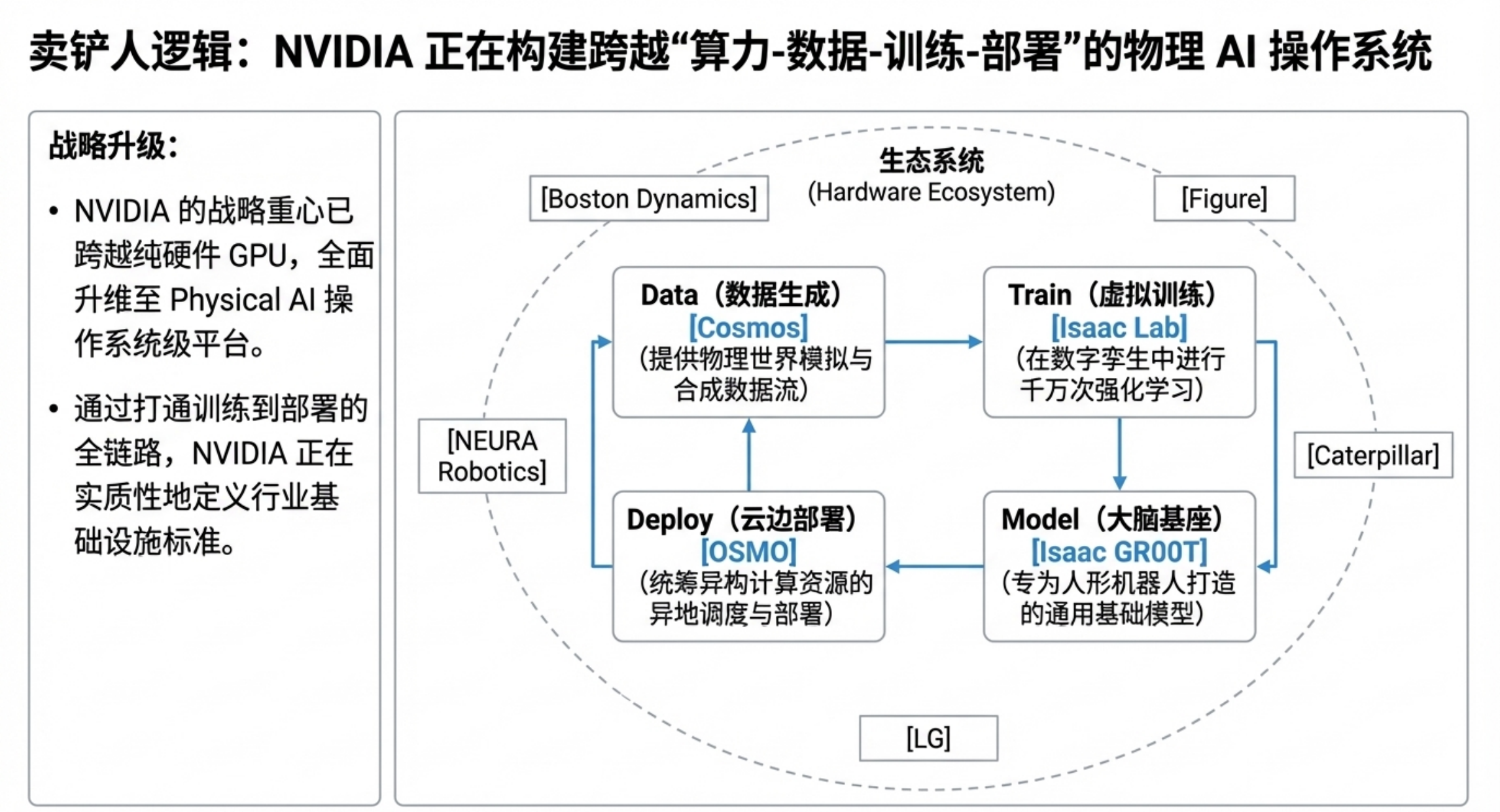 在大模型时代,NVIDIA凭借 GPU 与 CUDA 生态成为最大受益者;而在 Physical AI 时代,其角色正在进一步升级——不只是提供算力,而是试图构建一整套机器人时代的基础设施。