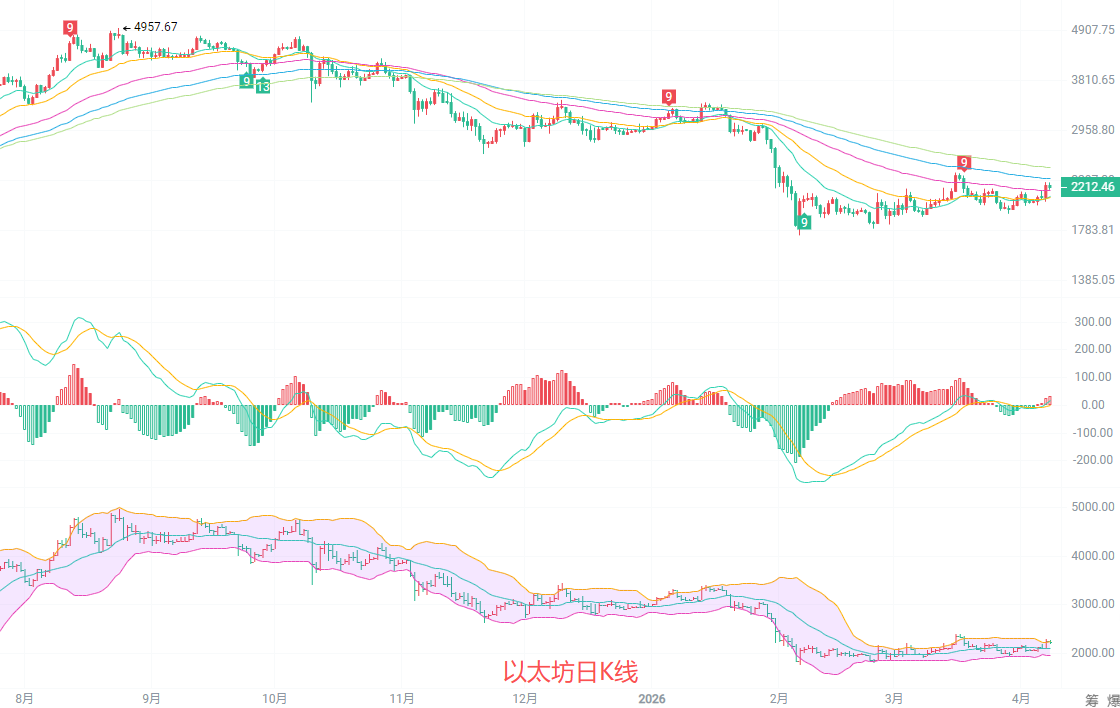 以太坊现价2215,做以太坊交易,联动比特币是核心,现在 BTC 反弹趋势明确,ETH 同步跟涨,大方向看多就别想着逆势做空,越空越亏。以太坊完成了一轮超跌反弹,突破2200关键压力位,结束了前期的下跌弱势格局。日线上EMA均线仍呈南下排列,但价格已经脱离下跌通道,有企稳反转的迹象;4小时图里布林带向上开口,MACD金叉红柱持续放量,北上动能全面激活,短期反弹趋势明确。不过大趋势尚未完全反转,上方2300-2350仍有强压,操作上以顺势低多为主,高空仅适合轻仓试错,严格控制风险。