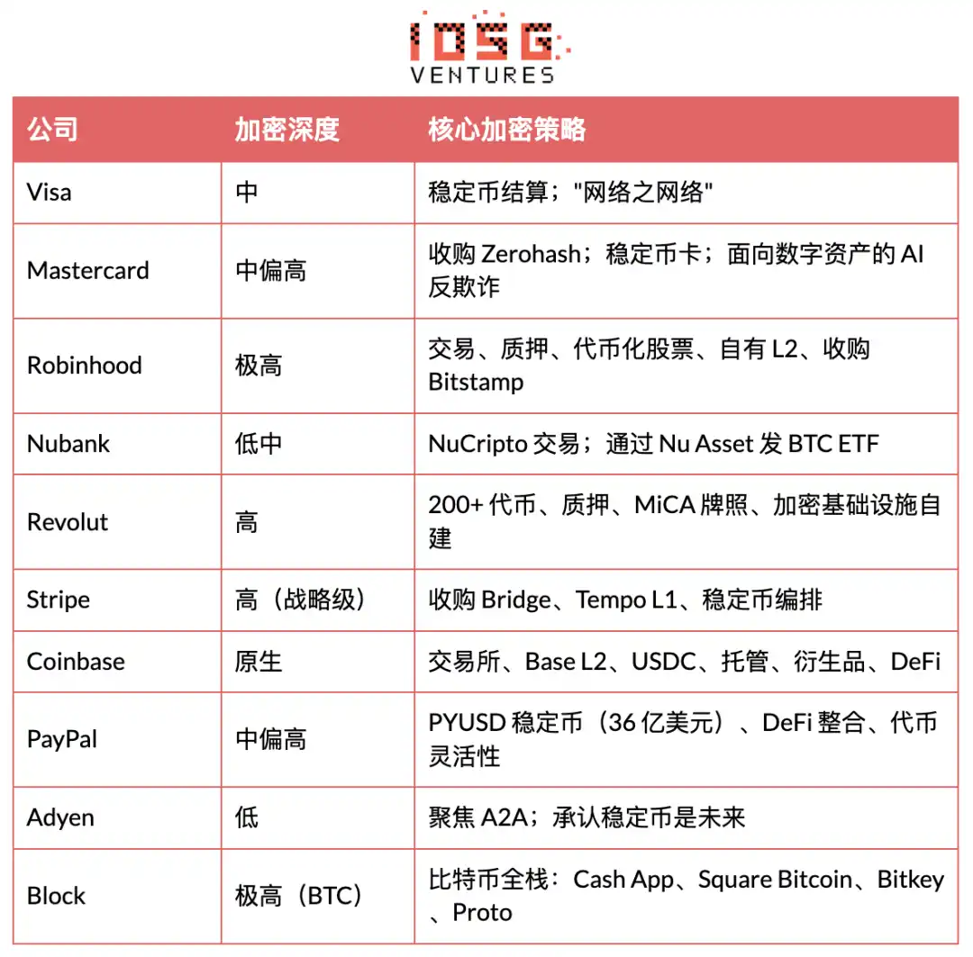几乎所有公司都把加密当作后端基础设施,而不是前端投机品。Visa、Mastercard、Stripe 和 Adyen 正在用稳定币升级结算层,同时保持 C 端体验不变。加密只有在「隐形」的时候才会成功。这是十家公司里最一致的模式,也贯穿了之后所有的整合策略。