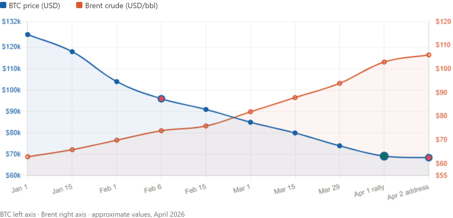 在极端冲突的初期,比特币的走势与原油、黄金等传统避险资产高度趋同。由于其抗审查、易于跨境转移的去中心化特性,比特币在局部战争和地缘动荡中往往被高净值人群和机构视为「数字避险通道」。此时,它吃的是对主权信用担忧的溢价。然而,真正令人拍案叫绝的是其在危机缓解期的迅速「变脸」。当停火传闻传出,原油价格因战争引发的供应链担忧消除而应声暴跌时,比特币却并未像传统避险资产那样遭遇抛售,反而因全球市场风险偏好的整体回归(Risk-on)而迎来了爆发式的上涨。