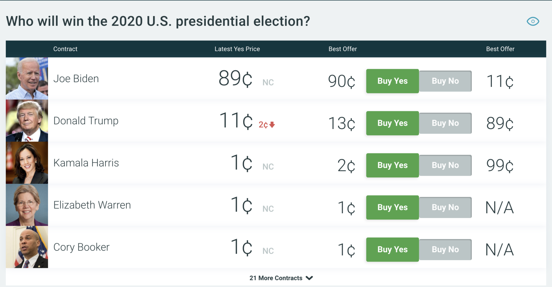 2010 年,Cantor Exchange 获得 CFTC 完全批准,推出电影票房期货市场,算是早期 CFTC 正式监管预测类合约的尝试。2014 年,由新西兰维多利亚大学运营的 PredictIt 推出,该平台沿用了 IEM 的学术导向模式,获得了 CFTC 的「不行动函」豁免,每人的交易上限仅有 850 美元。