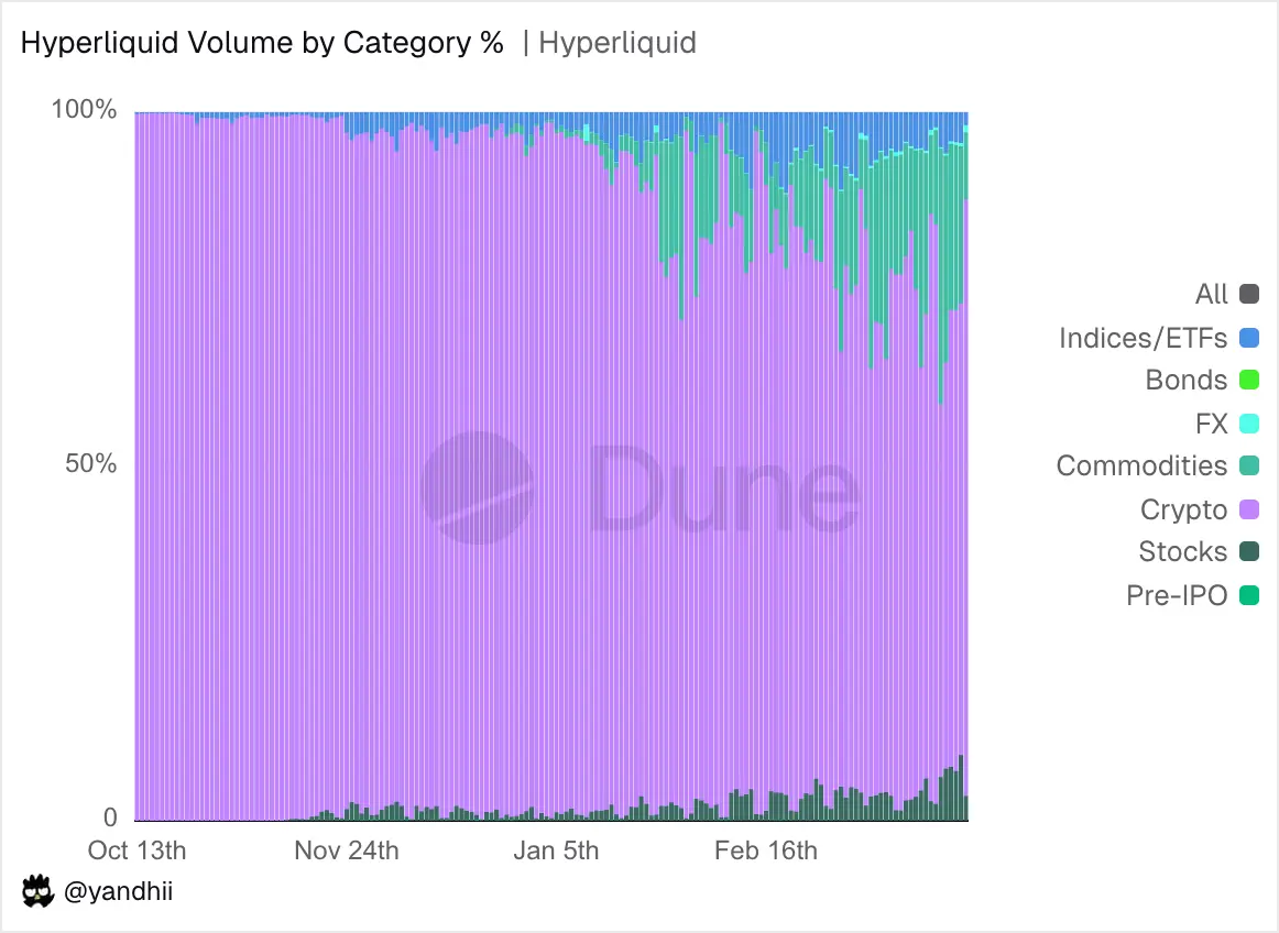 多年来,永续合约交易员仅仅投机于加密资产——BTC、ETH、SOL以及各种长尾山寨币。但在去年底,当永续合约交易量在更广泛的加密市场抛售中从近期峰值大幅降温时,RWA永续合约却开始发力。少数永续DEX上架了商品、股票及股票指数,将可交易资产的范围扩大到了包括英伟达、三星乃至SpaceX等私有公司,以及白银、钯金等大宗商品。