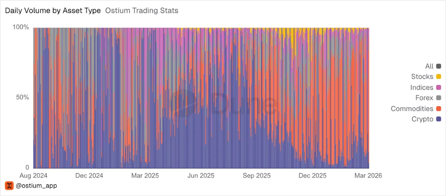 今年,RWA永续合约的增长愈发迅猛。在最近几周,RWA在Hyperliquid总交易量中的占比一度高达44%,且RWA交易对如今已稳定成为该交易所产生手续费最高的交易对之一。在Ostium上,数月来RWA一直占据着该交易所绝大部分的交易量。
