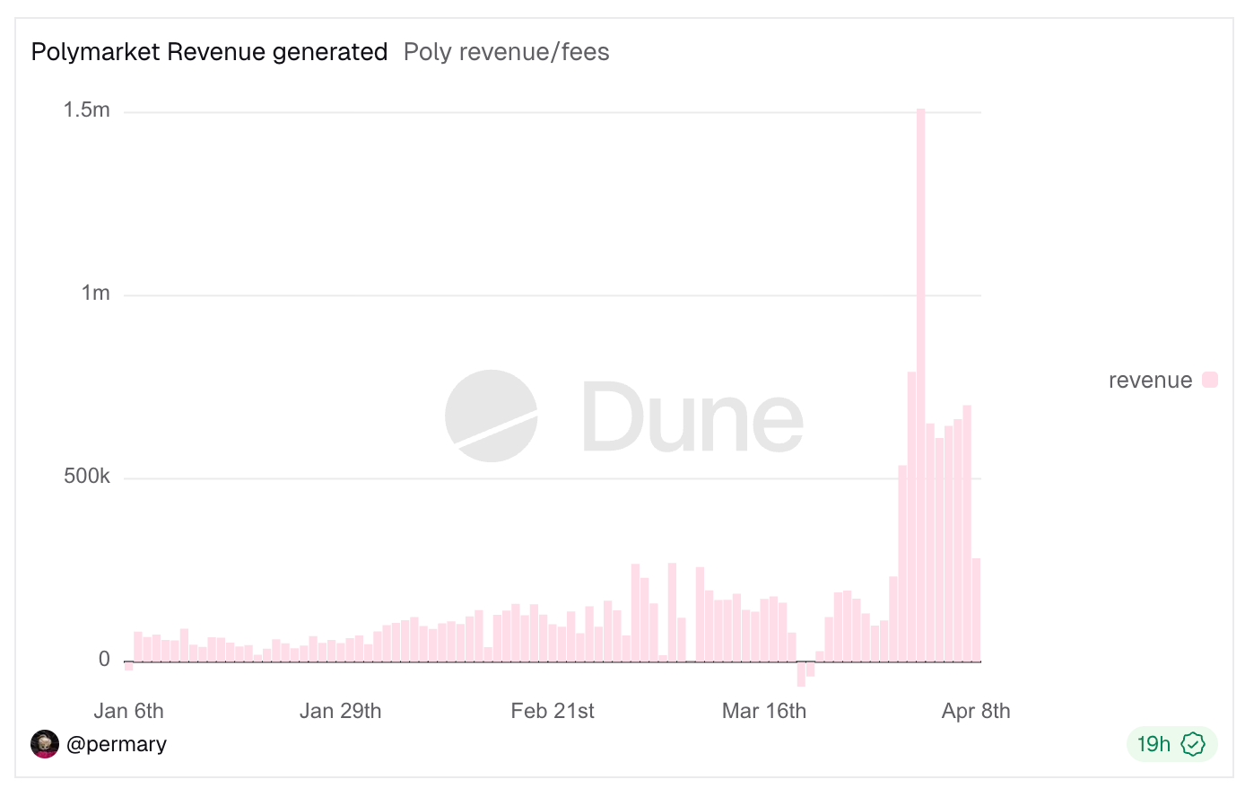 最新的案例是彻底打开了手续费闸门的 Polymarket。自近期扩大手续费范围并修改手续费公式(推荐阅读:《硬核拆解Polymarket手续费公式:90+%的极端费率是怎么蹦出来的?》)以来,Polymarket 的营收能力已大幅跃升;截至发稿前,Polymarket 的手续费总收益已超 2400 万美元,4 月 2 日单日更是创下 150 万美元的日收益记录。