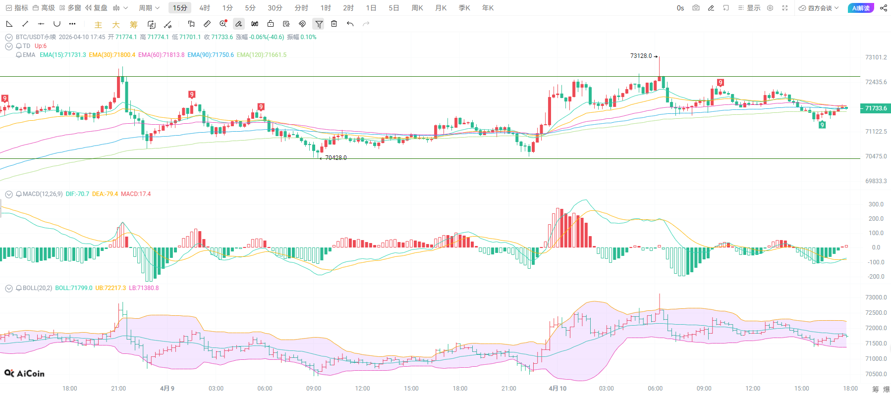 两小时处于多头趋势中的回踩阶段,目前在71730附近企稳,布林带中轨 71533成为关键承接位,下轨70530支撑力度极强。MACD指标绿柱动能缩量明显,DIF与DEA双线有拐头向上趋势,南下动能即将耗尽。均线系统中,短期EMA15向上运行,长期EMA120支撑稳固,形成下有支撑、上有压力的格局。当前价格距离中轨仅一步之遥,属于超跌反弹良机,若能反弹突破72000阻力,将快速打开上涨空间,激进者可提前布局多单,博弈反弹行情。
