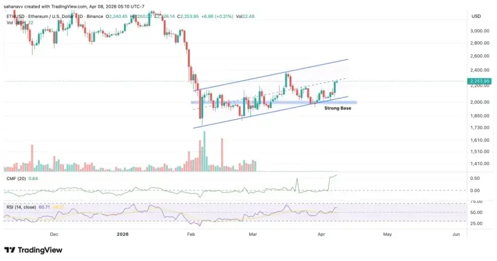 随着比特币寻求突破,以太坊也正悄然进入2,200美元至2,250美元的阻力区。TradingView以太坊显示以太坊从1,950美元至2,000美元的致命底部反弹,在上升通道内形成了“更高低点”的格局。这表明它采取的是纵向延伸策略,绕过了突破。