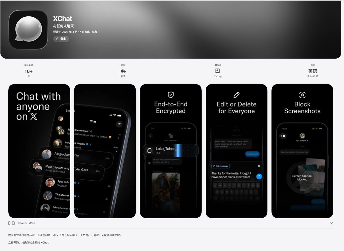 我记得以前 马斯克 就准备修改 X 里的聊天(私信),做成一个独立工具,应该就是现在的准备推出的 XChat 了,我查了一下,本质确实就是基于 X 中的聊天单独剥离出来的。