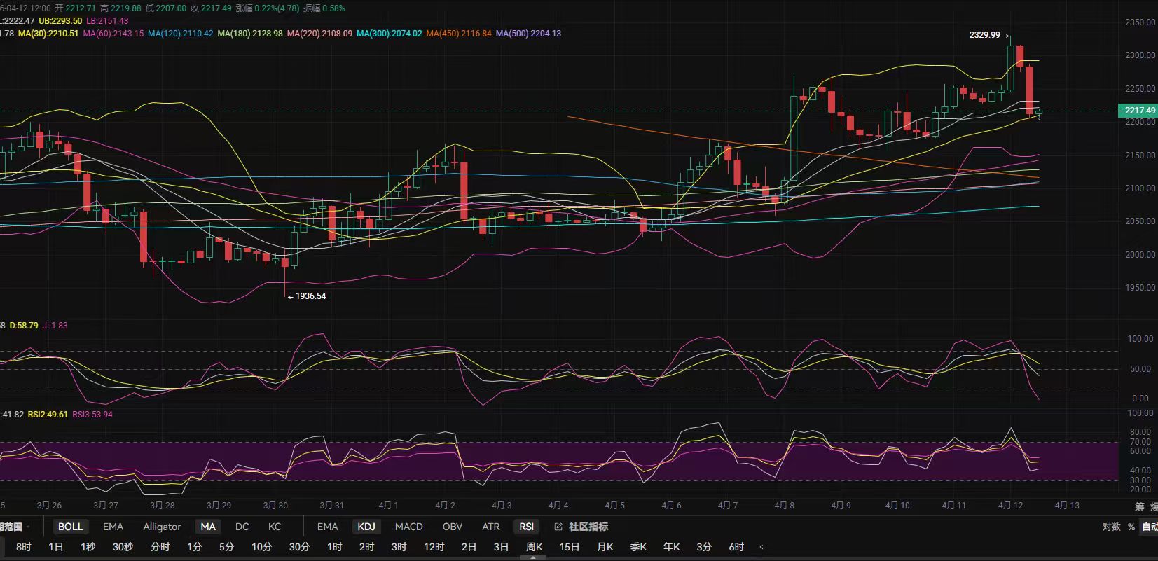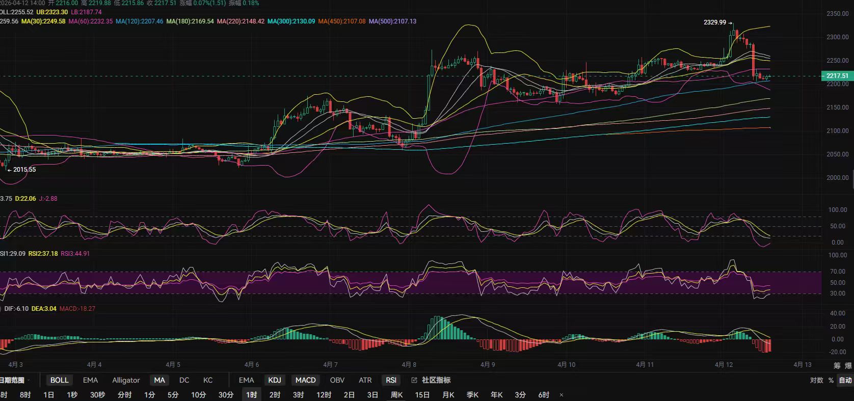 以太坊凌晨行情如期破位前高顺利到达2300上方,拿了两天的多单再次收入囊中,实战记录已更新可查;白盘行情再次面临回落趋势,1小时布林带呈开口形态,k线回调MA120位置后形成止跌震荡,MACD中0轴下方量能收缩,空头力量逐步减弱,快慢线死叉后初见收口意向,KDJ与RSI有接近超卖后拐头信号,历辉建议既然下来了可继续保持低多接入!