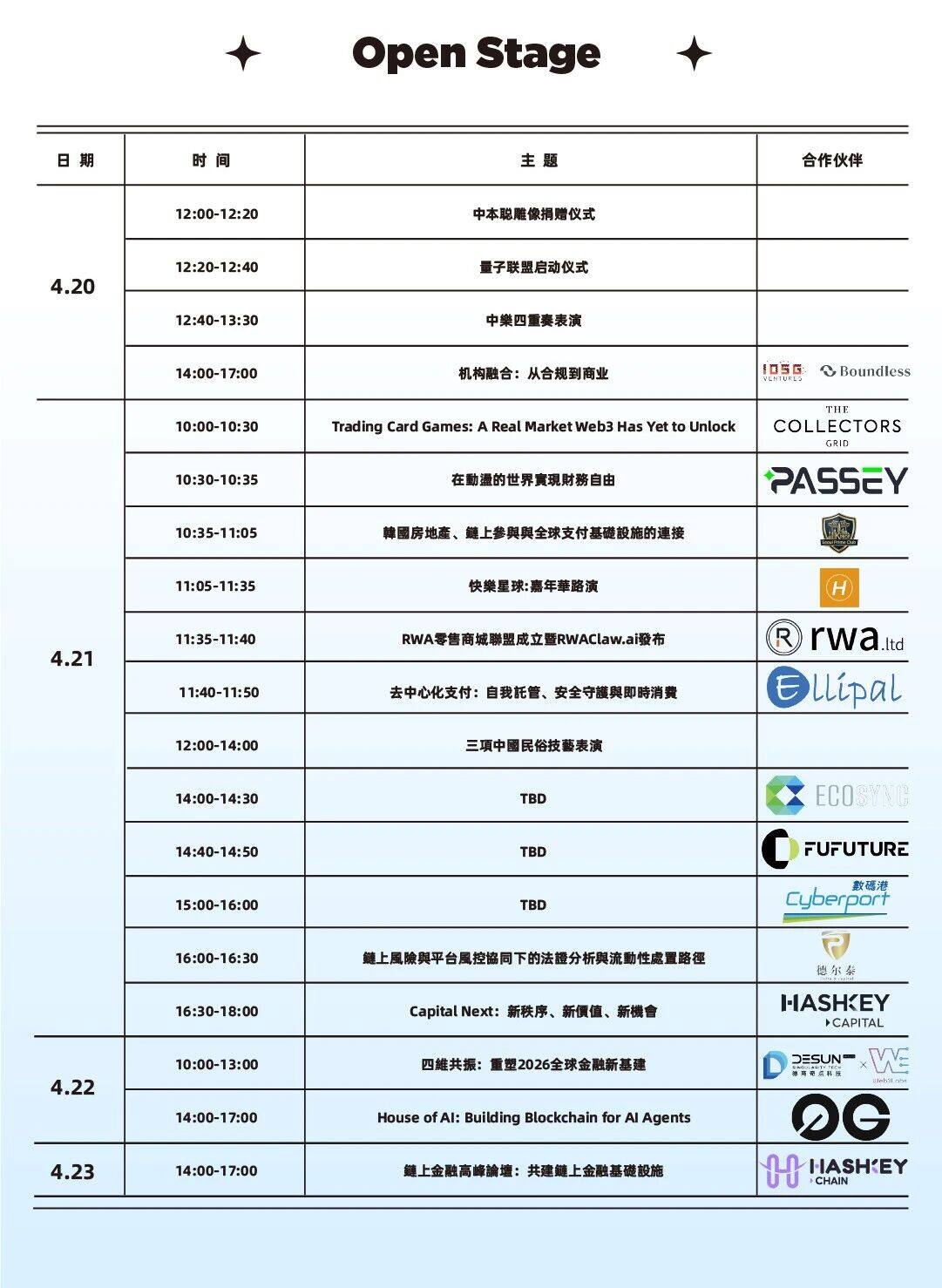 为期四天的活动中,0G、德尔泰、德商奇点科技 x Web3Labs、HappyPlanet、IOSG x Boundless、K-Prop、TCG.ZONE(按首字母音序排列)等团队将轮番登场,带来前沿分享与精彩呈现,展现多元生态的探索前沿。同时,多元启动仪式及中乐四重奏、民俗技艺等精彩表演也将在此登台,为这场行业盛会增添别样韵律。