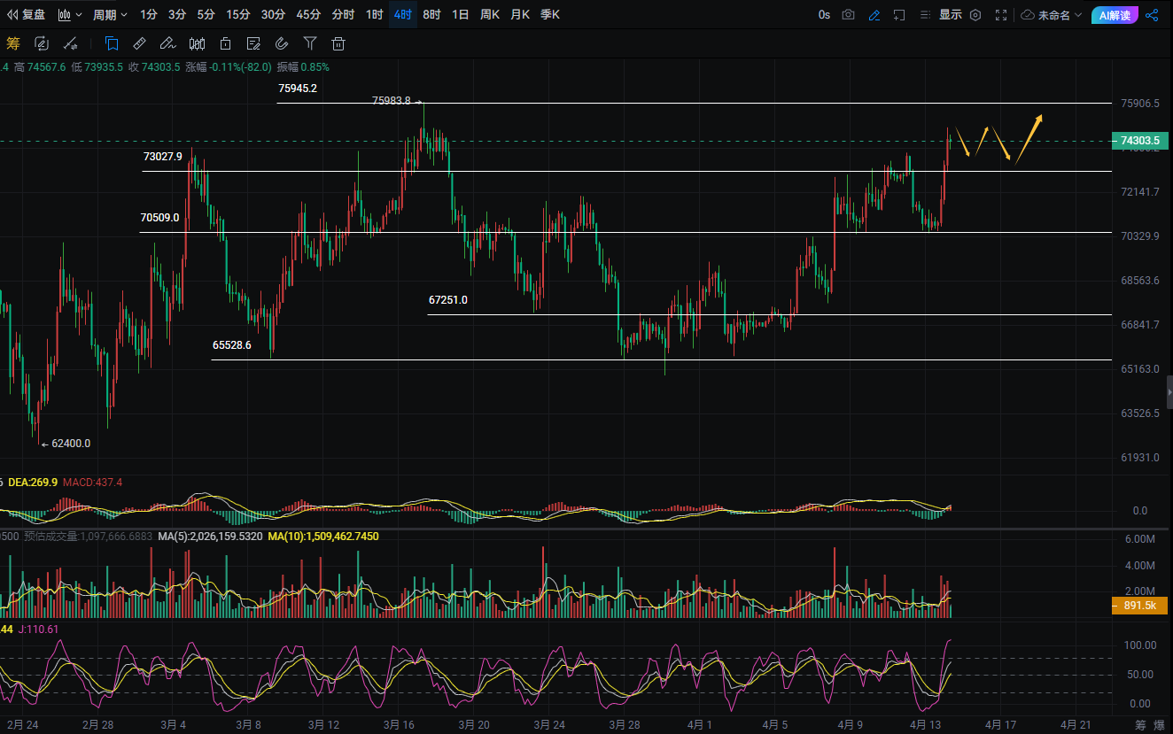 币圈院士:4.14比特币午后冲高测试压力,74500 上方如何应对?最新行情分析