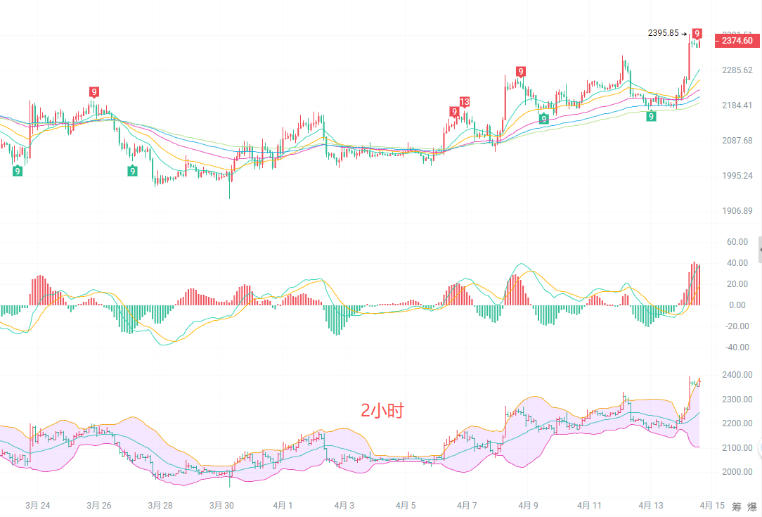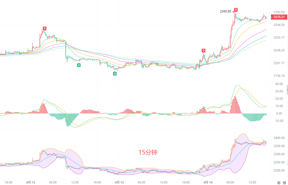 十五分钟K线2156启动后,走出流畅的上行趋势,当前在2374附近高位盘整。均线系统依旧向上,但MACD红柱持续缩量,DIF线有拐头迹象,短期北上动能不足。布林带当前处于收口状态,上轨2378形成短期压力,下轨2354构成支撑,南北进入短期博弈阶段,需警惕冲高回落的风险。