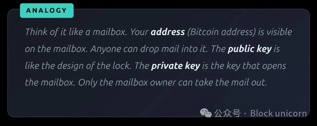 比特币地址—— 公钥的缩短哈希版本。当有人向你发送比特币时,他们会将其发送到你的地址。关键在于,该地址通过两层哈希算法(SHA-256 + RIPEMD-160)隐藏了实际的公钥,从而增加了一层额外的保护。