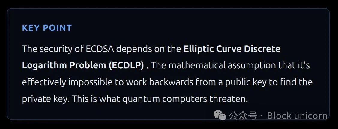 Shor算法可以从公钥推导出私钥。如果攻击者知道你的公钥,并且能够访问足够强大的量子计算机,他们就可以计算出你的私钥并窃取你的比特币。这彻底破坏了 ECDSA 算法。
