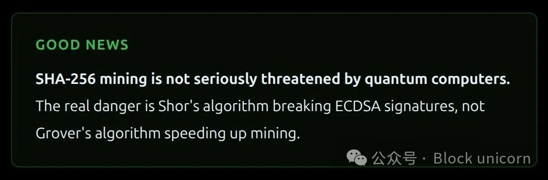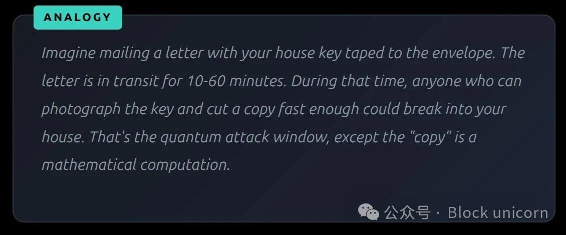 一个观察内存池的量子攻击者可以看到你的公钥,推导出你的私钥,构造一个与你的交易竞争的交易,将你的比特币发送给自己,并且(如果他们也拥有挖矿资源)可以在你的合法交易之前获得确认。整个攻击过程必须在几分钟内完成。