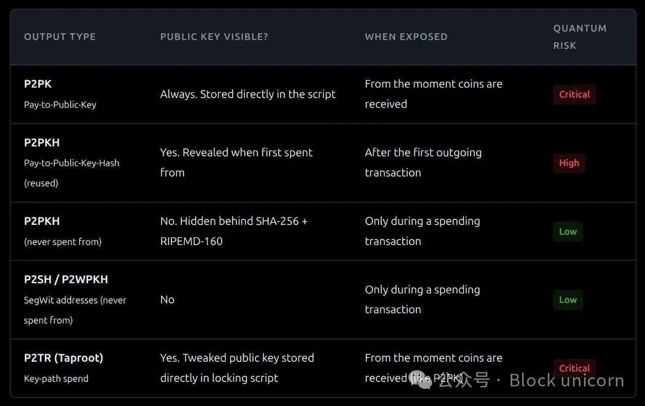 正是在这里,我开始意识到情况远比「量子攻击=所有比特币都注定毁灭」复杂得多。并非所有比特币都同样脆弱。关键问题在于:公钥在区块链上是否可见?