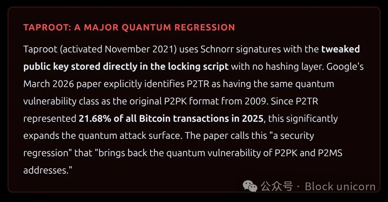 最新的比特币标准输出格式,于 2021 年 11 月随 Taproot 升级引入。P2TR 使用 Schnorr 签名(一种比 ECDSA 更高效的替代方案),并支持两种消费路径:简单的「密钥路径」消费和更复杂的「脚本路径」消费,后者支持高级智能合约功能。从量子力学的角度来看,问题在于:P2TR 将修改后的公钥直接存储在锁定脚本中,没有哈希层对其进行隐藏。这意味着,从收到比特币的那一刻起,公钥就与 2009 年的旧版 P2PK 格式一样,在区块链上可见。地址以bc1p开头。