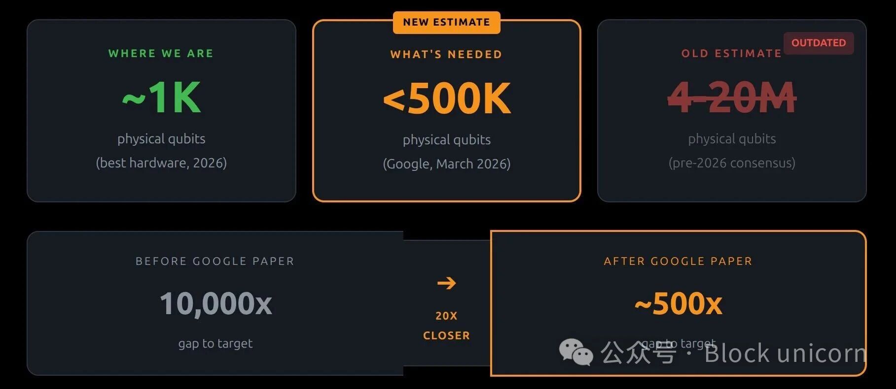 破解比特币 ECDSA 所需的硬件——早期的估计范围在 400 万到 2000 万个物理量子比特之间(2022 年萨塞克斯大学的一项研究估计,如果攻击持续 1 小时,则需要 3.17 亿个物理量子比特)。然而,谷歌量子人工智能在 2026 年 3 月发表的一篇论文中大幅降低了这一数字,降至不到 50 万个物理量子比特,比之前的估计减少了约 20 倍。本文提出了两种电路变体:一种使用 ≤1200 个逻辑量子比特和 9000 万个 Toffoli 门,另一种使用 ≤1450 个逻辑量子比特和 7000 万个 Toffoli 门。这将在第 5 部分详细介绍。