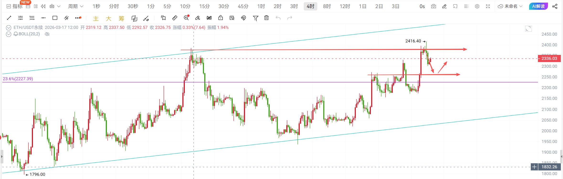 以太2350-2370做空,目标2300-2250,2400上方损;