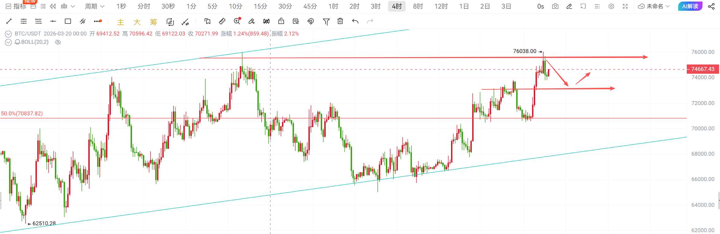 大饼75000-75500做空,目标74000-73000,76000上方损;
