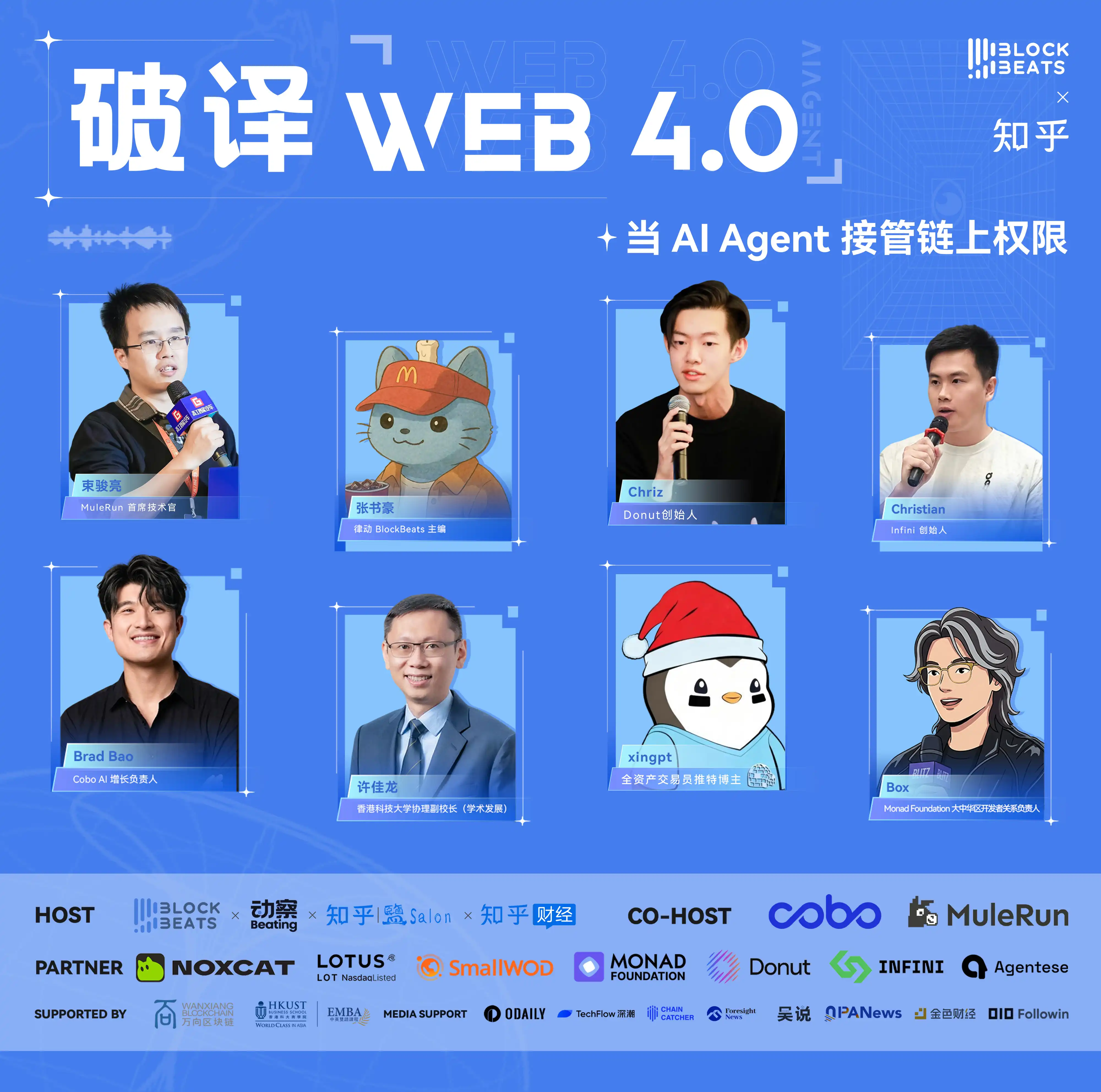 4 月 21 日,律动 BlockBeats 联合知乎,在香港举办「破译 Web 4.0:当 AI Agent 接管链上权限」。目的就是要在第一时间捕捉到,AI Agent 与链上结合,不久以后我们会面临什么样的金融场景。