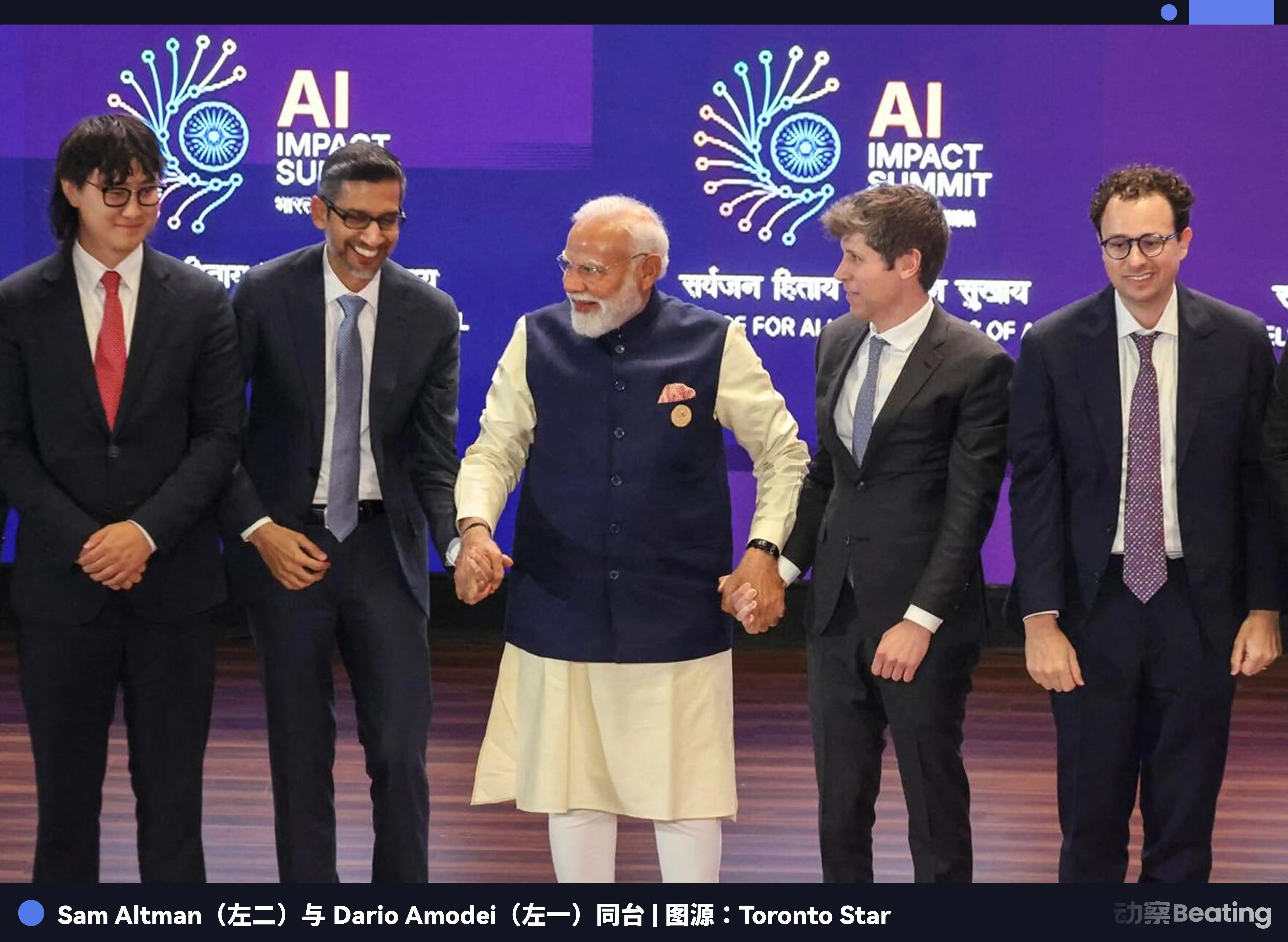 2 月 19 日新德里 AI 峰会上,莫迪邀请台上十三位科技领袖手拉手合影。所有人都照做了,除了站在相邻位置的 Altman 和 Dario。两人各自举起拳头,没有任何身体接触,这个画面在社交媒体上病毒式传播。Altman 事后说自己不知道发生了什么,Dario 没有公开评论。