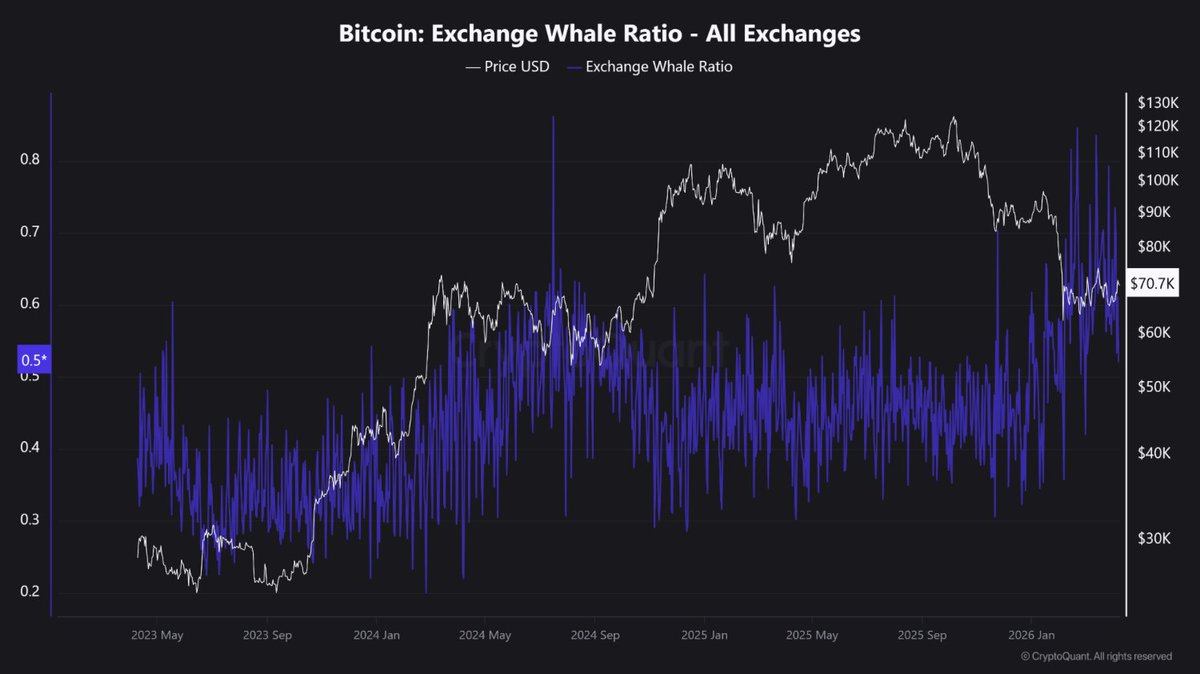 链上数据也反映出这种转变:2026 年 3 月,比特币交易所余额跌至近两年来的最低点。流入交易所的比特币中,64% 来自排名前 10 的钱包。
