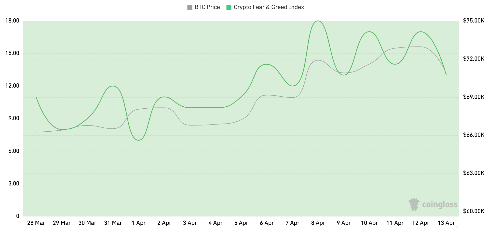 加密货币恐慌指数为13,显示为极度恐慌。