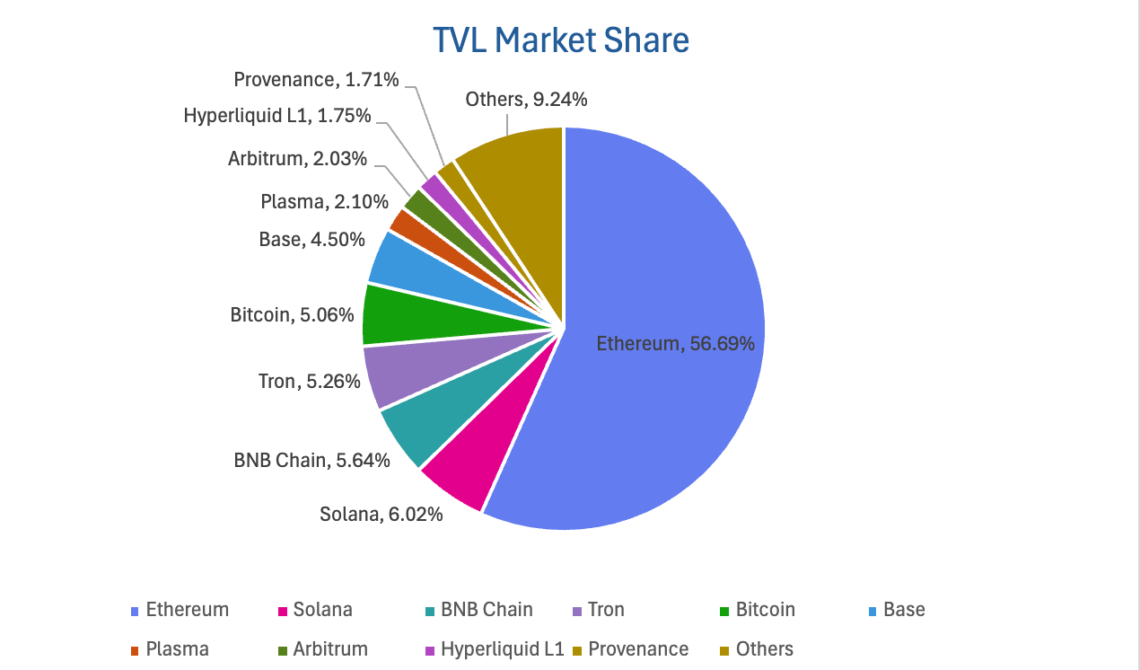 按公链进行划分,其中TVL最高的三条公链分别是Ethereum链,占比56.69%;Solana链,占比6.02%;BNB Chain,占比5.64%。