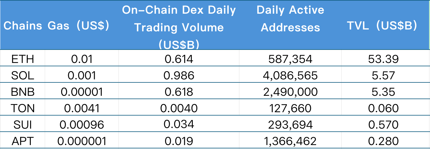 主要从日交易量、日活跃地址、交易费用分析目前主要Layer1含ETH、SOL、BNB、TON、SUI以及APTOS的相关数据。