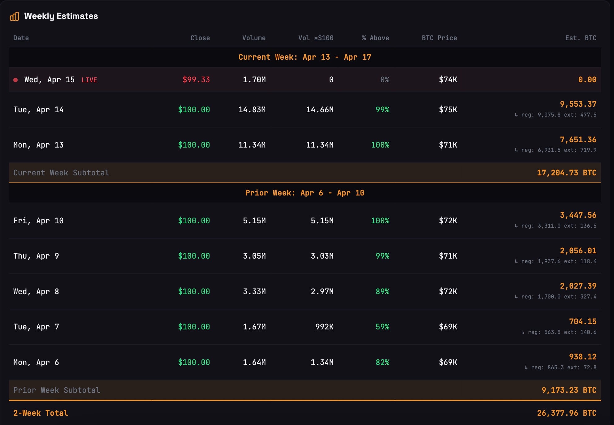 根据本周的报告,从4月13日开始,STRC机制继续将市场流动性转化为直接比特币购入。根据strc.live的数据,在当前的一周内,已经筹集资金购买17,284.73个BTC。