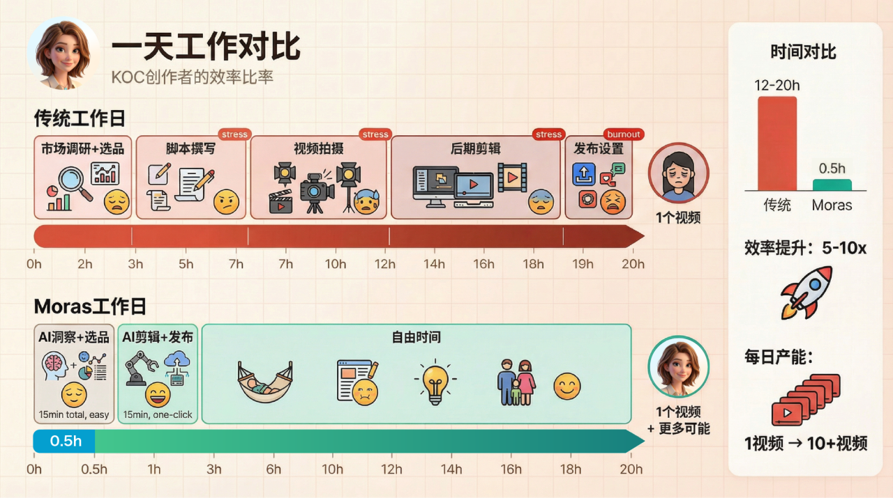这种商业模式还有一个深层含义:它改变了用户和 AI 的关系。传统的 AI 工具,用户是在操作一个软件,需要学习怎么用、怎么调参数、怎么优化提示词。但 Moras 不是。用户和 Moras 的关系,更像是雇主和员工。你告诉它你想带什么品类的货,它自己去做决策、做执行、做优化。这种"AI as a Service"而非"AI as a Tool"的定位,才是真正符合 AI 原生时代的产品形态。