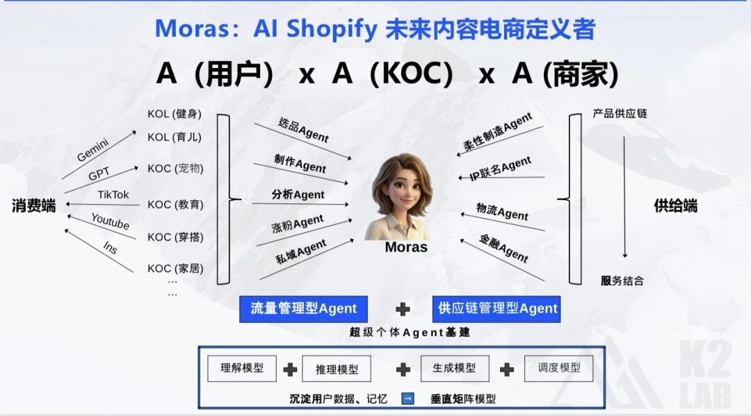 什么是 A to A to A?第一个 A 是消费者的 Personal AI,可能是 ChatGPT,可能是龙侠,也可能是未来某个开源框架。第二个 A 是 KOC 的数字分身,由 Moras 提供的 Agent OS 支撑。第三个 A 是商家的供应链 Agent。这三个 Agent 之间不需要通过传统的电商平台来连接,而是直接通过协议进行信息交换和交易撮合。