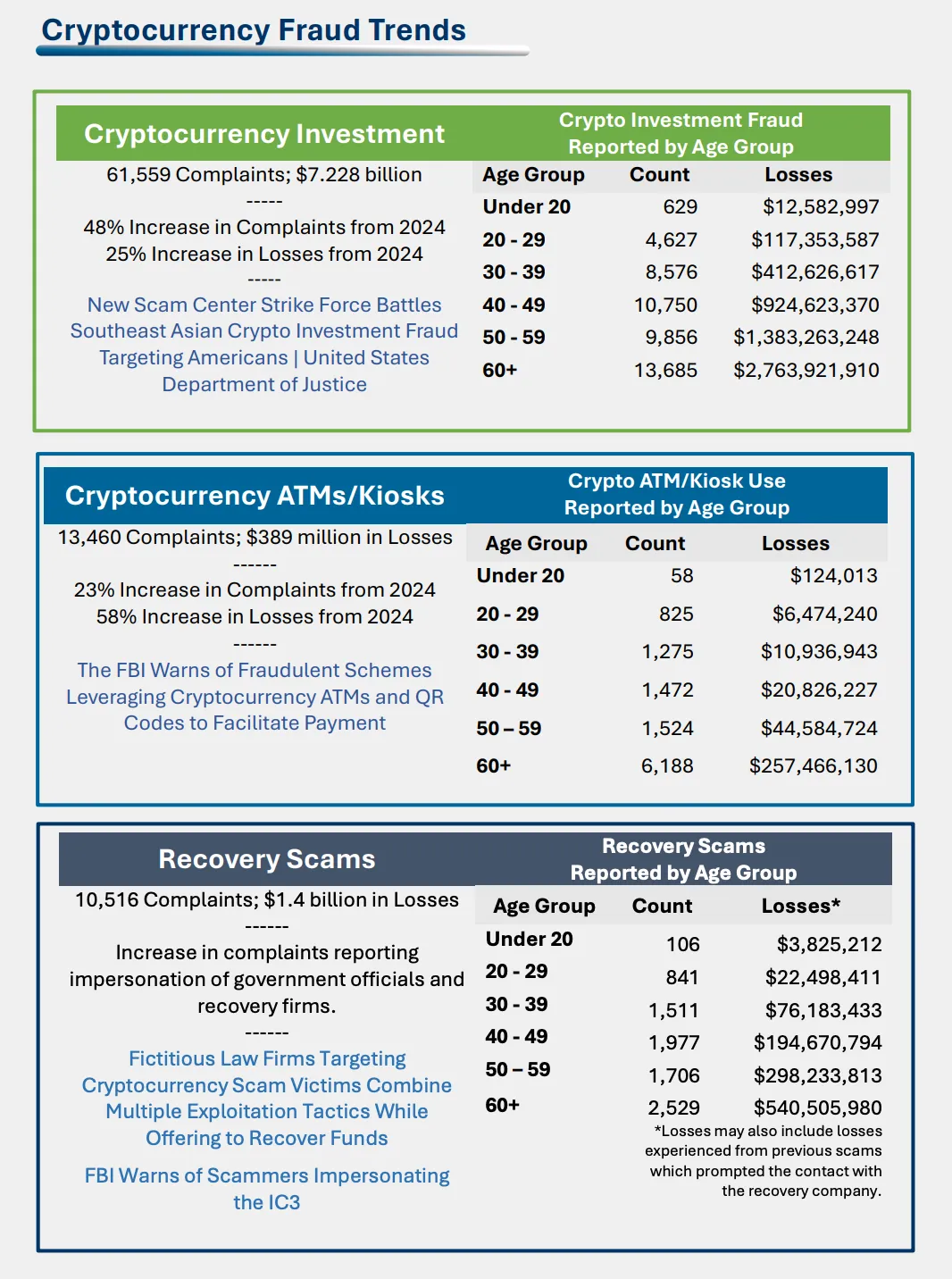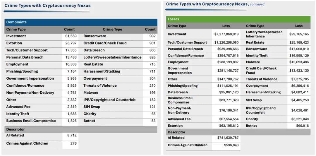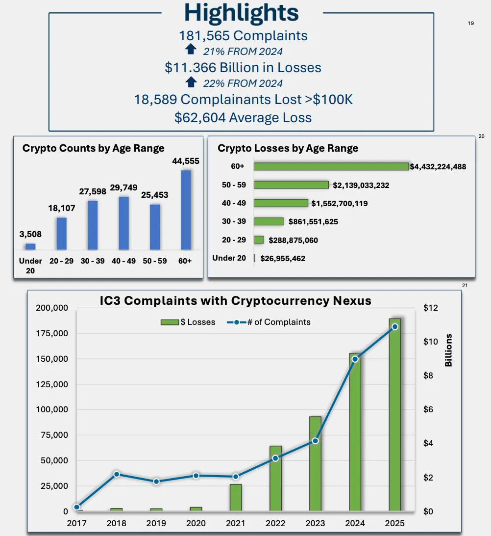 加密货币相关投诉共计 181,565 起,累计造成损失 113.66 亿美元,较 2024 年增长 22%。其中,18,589 名投资者的损失超过 10 万美元。在所有投诉者中,60 岁以上群体占比最高。