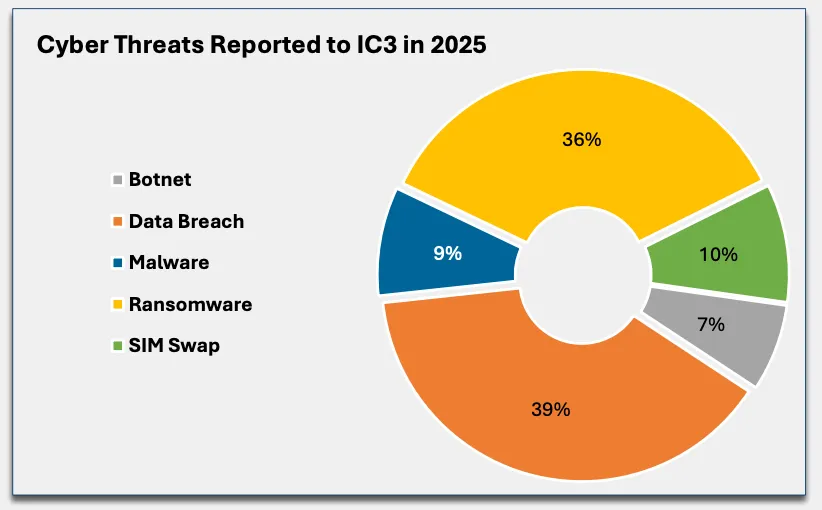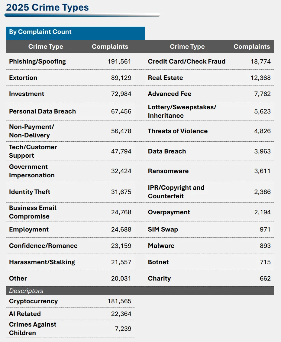 2025 年向 IC3 申报的网络威胁类型包括:
