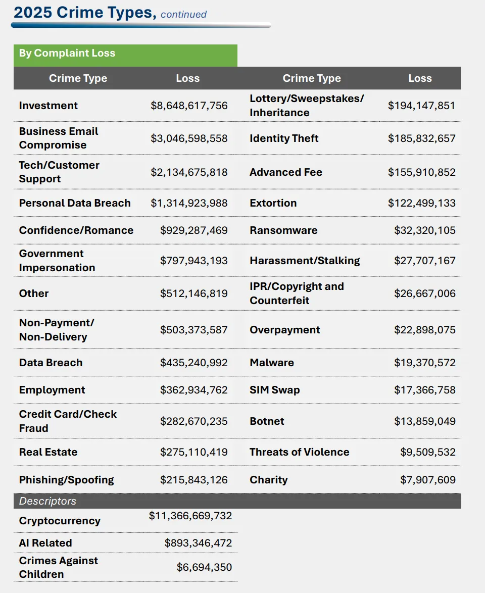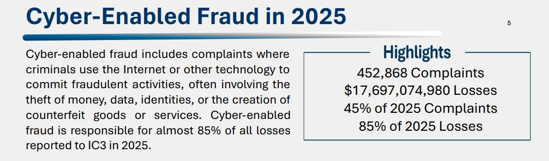 2025 年,IC3 收到 452,868 起网络诈骗投诉,造成 176.97 亿美元损失,占全年总损失的 85%。