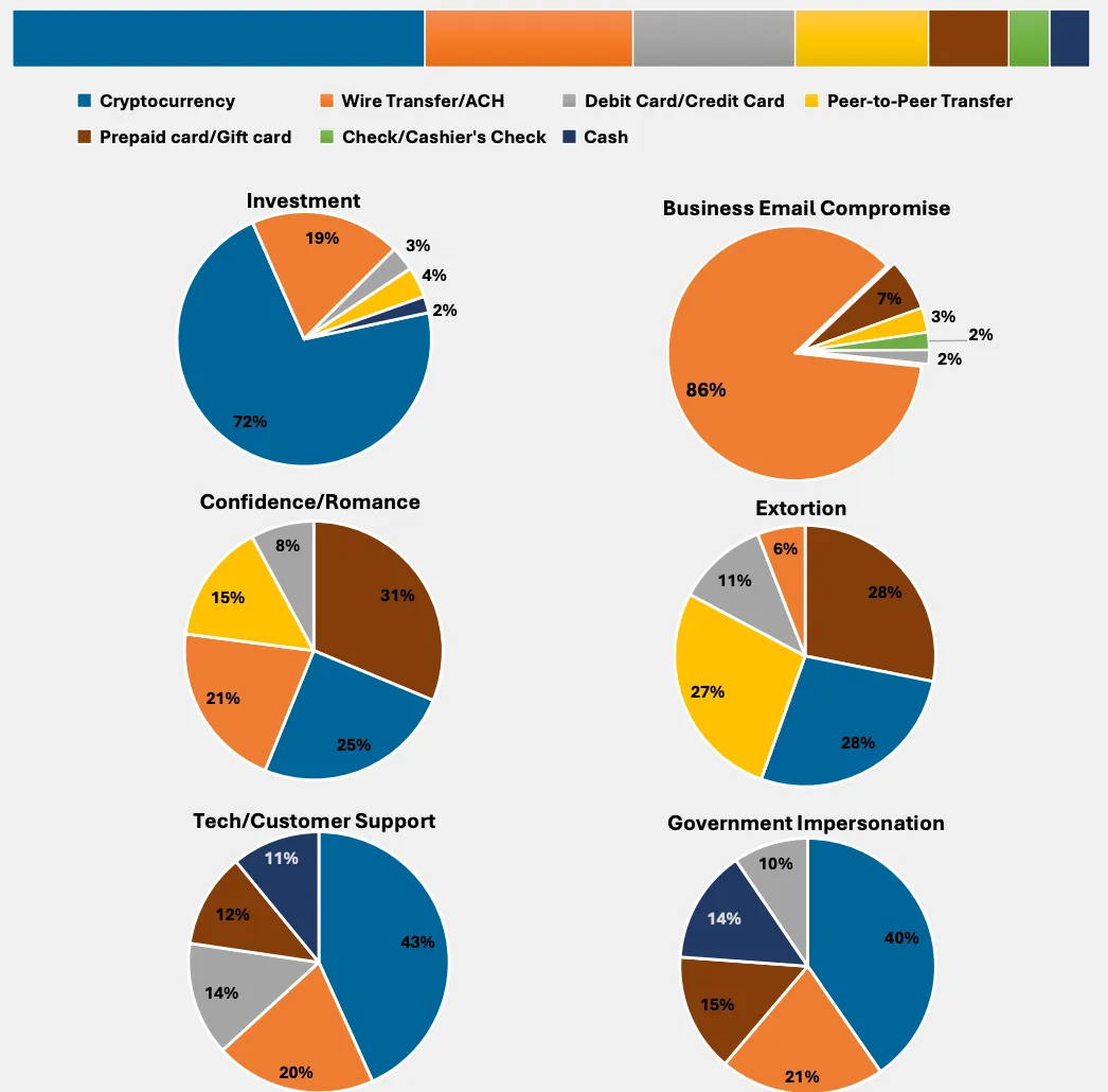 • 损失最大:投资诈骗(约 72.8 亿美元)、技术支持 / 客服诈骗(约 12.3 亿美元)。