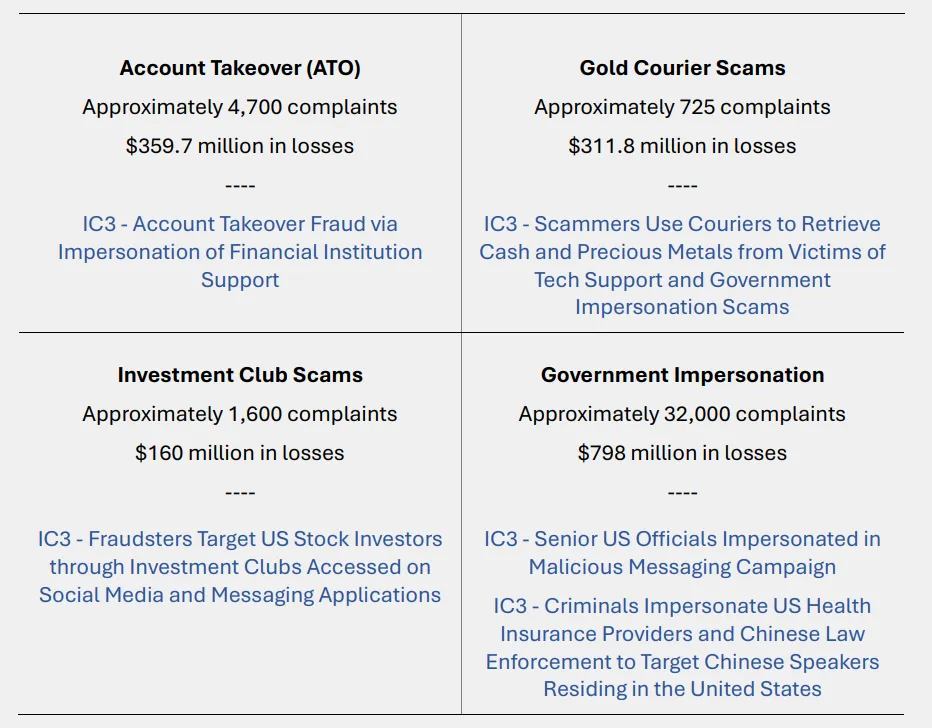 - 损失最多的诈骗类型:投资诈骗、技术支持 / 客服诈骗、情感 / 信任诈骗、商业邮件诈骗 (BEC)、冒充政府官员诈骗。