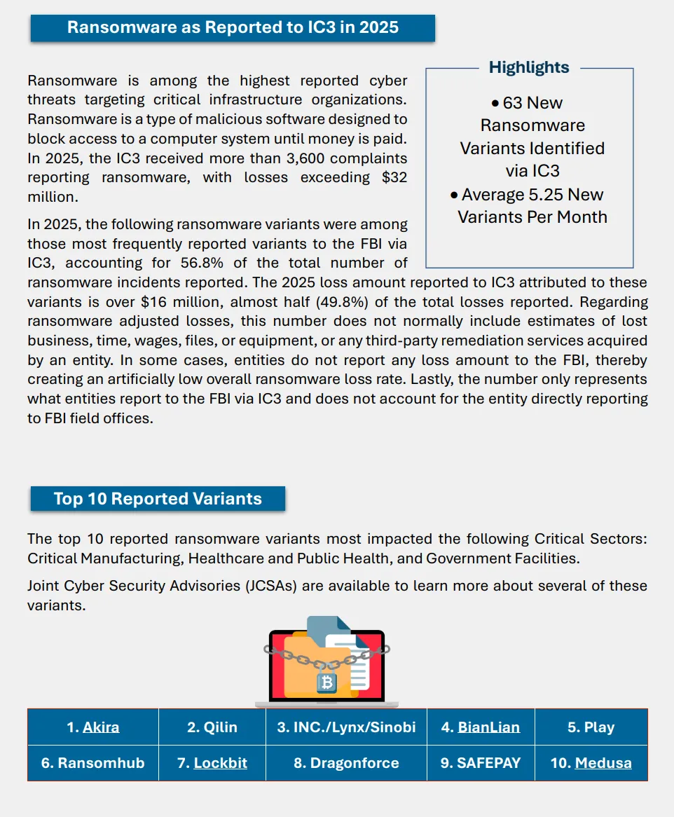 其中,3600 起勒索软件投诉造成超过 3200 万美元损失。主要勒索软件变种包括 Akira、Qilin、 INC./Lynx/Sinobi、BianLian、Play、Ransomhub、Lockbit、Dragonforce、SAFEPA、Medusa。