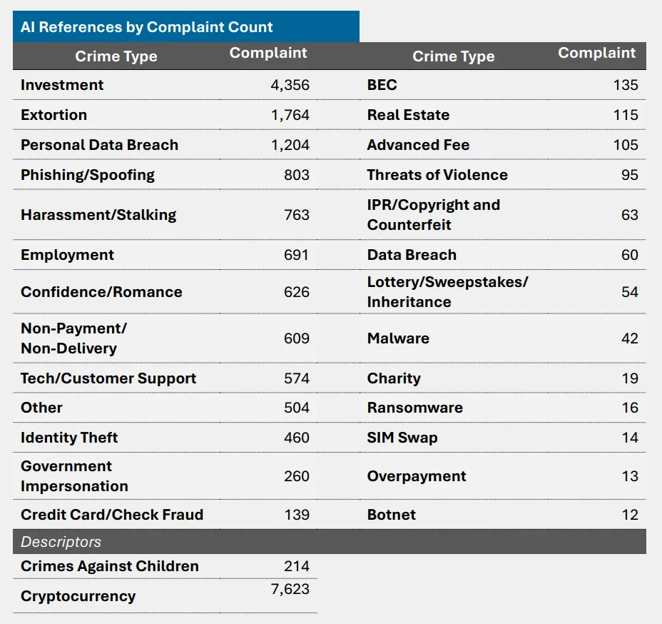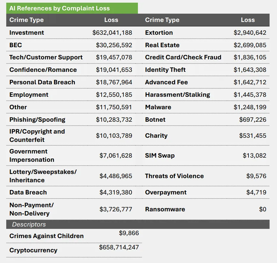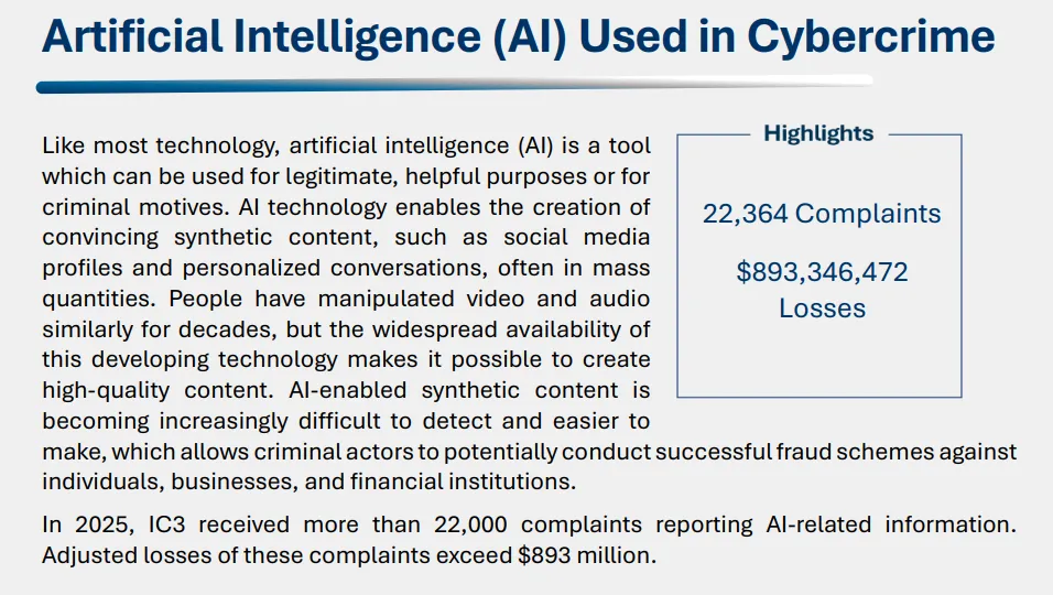 2025 年,IC3 共收到超过 2.2 万起涉及 AI 相关信息的投诉。这些投诉所造成的损失总额超过 8.93 亿美元。