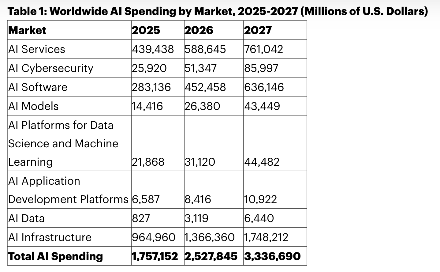 美国市场调研公司 Gartner 的一份报告指出,2026 年全球 AI 支出将达到 2.52 万亿美元,同比增长 44%;其中仅 AI 基础设施(包括服务器、加速器、存储和数据中心平台在内)一项预计就将消耗约 1.37 万亿美元,超过总支出的一半。